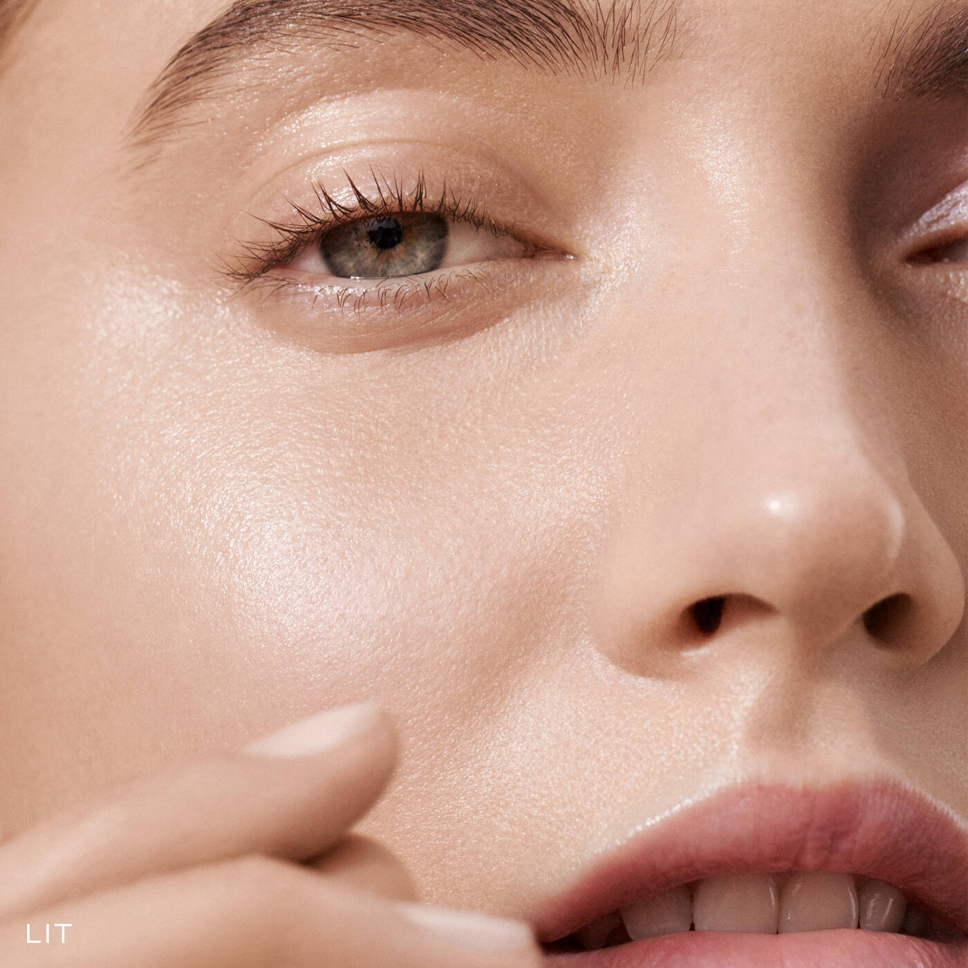 - Für einen subtilen Schimmer direkt auf die Lichtpunkte des Gesichts auftragen und darüber die Foundation.
