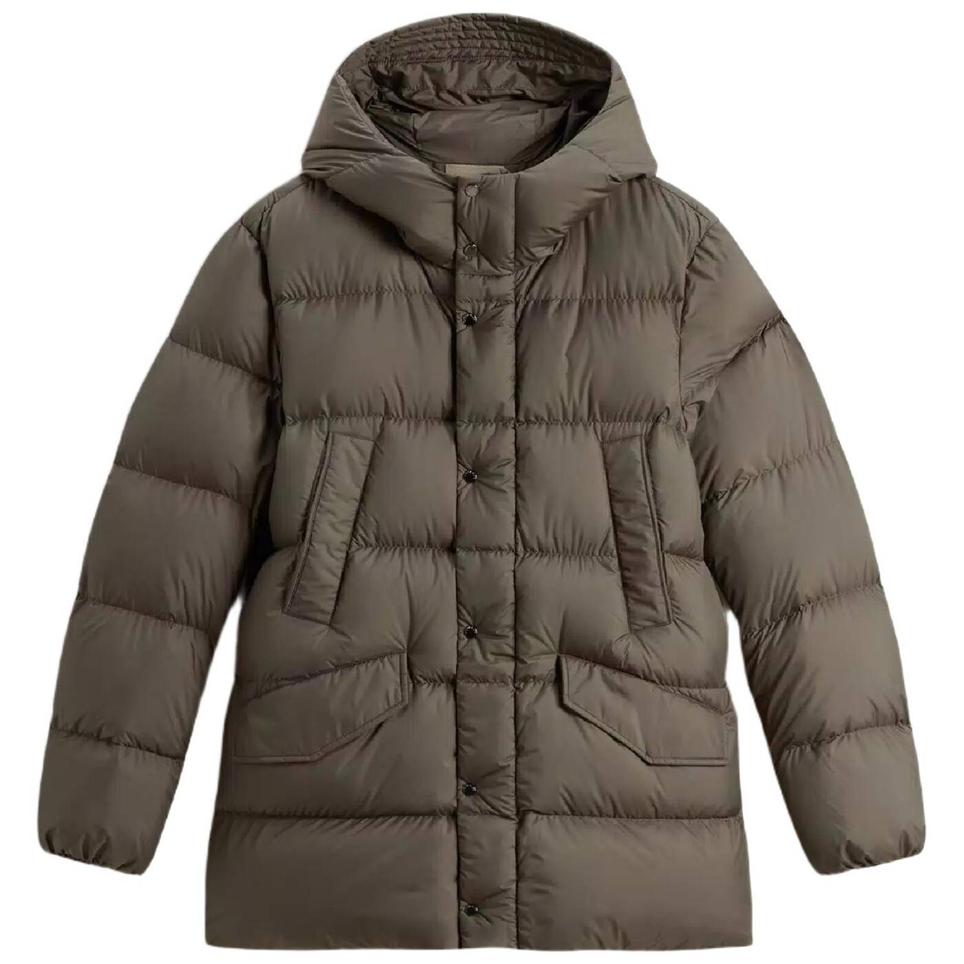 Das mit Entendaunen gefütterte Design sorgt für optimale Wärme, ohne die Silhouette zu beschweren. Das Modell, das Schutz und Komfort bietet, verfügt über eine Kapuze mit integriertem, hohem Kragen und Blende, die sich hinten durch einen Kordelzug verstellen lässt. Der Zwei-Wege-Frontreißverschluss wird durch eine Leiste mit Druckknöpfen verdeckt, während zwei zusätzliche Knöpfe am Kragen für extra Schutz vor Kälte sorgen. Das Design verfügt über eine Reihe praktischer Taschen: zwei Paspeltaschen und zwei Pattentaschen, alle mit verdeckten Druckknöpfen, und zwei praktische Innentaschen, davon eine mit Reißverschluss. Der Kordelzug am Saum ermöglicht eine individuelle Passform. Der Logoprint an der Kapuze und das seitliche Label vervollständigen das Kleidungsstück.