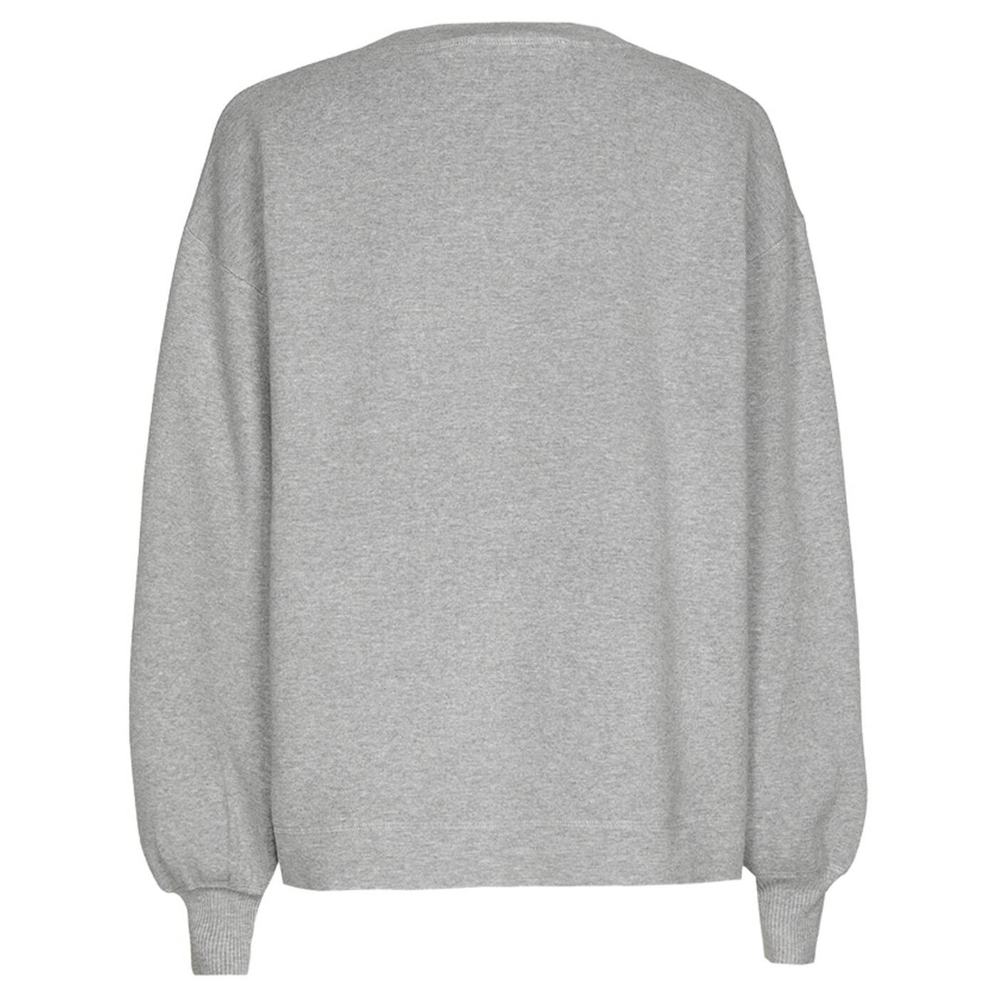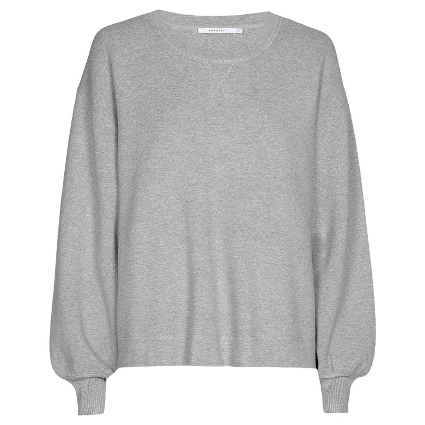 Das Oberteil hat einen runden Ausschnitt und lange Ärmel mit elastischen Bündchen. Der Stoff ist weich und leicht strukturiert. Die Passform ist locker und schlicht, ohne auffällige Details.