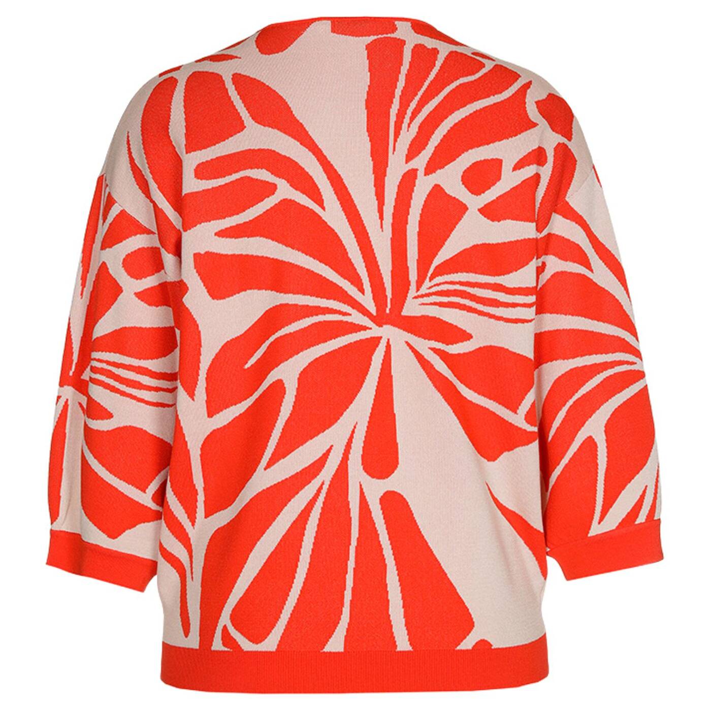 Pullover mit einem V-Ausschnitt und 3/4-Ärmeln. Der Stoff hat ein abstraktes, grafisches Muster in einer symmetrischen Blattform.